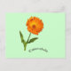 Orange flower with raindrops on petals, arched text=Calendula (colored background)