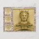 Architectural faces from several buildings. On left side of card are three small images of keystone details (monks heads). Major portion of card shows larger image of a female head with olive leafed crown. All images are framed with horizontal red clay bricks.