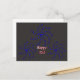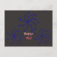 Fireworks offer a "Happy 4th!" greeting. Pinwheels of bright blue stars surround the text that shows in red and white with drop shadowing. Background is a dark gray.