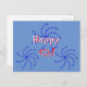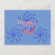 Fireworks offer a "Happy 4th!" greeting. Pinwheels of bright blue stars surround the text that shows in red and white with drop shadowing. Background is a medium blue.