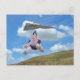 Pig flying. Doll and hang glider are toys crocheted of yarn. Image shows piglet flying above a grassy hill among fluffy white clouds. Relates the sentiment that nothing is impossible.