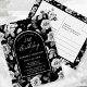 Very elegant black and white rose floral pattern creates a 21st birthday postcard invitation template. White text and calligraphy are framed by a black arch edged in white. This item is part of the Black and White Rose Floral Collection. it contains templates to create a unique invitation suite, welcome signs and party decorations.