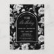 Very elegant black and white rose floral pattern creates an 90th birthday postcard invitation template. White text and calligraphy are framed by a black arch edged in white. This item is part of the Black and White Rose Floral Collection. it contains templates to create a unique invitation suite, welcome signs and party decorations.