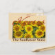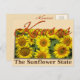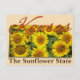 Kansas is named after the Kansa Native American tribe which originally inhabited the area. Though the official nickname is "The Sunflower State", Kansas is also called "The Free State" and "The Wheat State". By 2015, Kansas was one of the most productive agricultural states in the country, producing high yields of wheat, corn, sorghum and soybeans. The state's most famous appearance in literature was as the home of Dorothy Gale, the main character in the novel "The Wonderful Wizard of Oz". When Dorothy said, "There's no place like home," she was referring to Kansas. Laura Ingalls Wilder's "Little House on the Prairie", published in 1935, is another well-known tale about Kansas. Even Superman was said to hail from Kansas . . . from the fictitious town of Smallville. Pizza Hut restaurants opened their first location in Wichita, Kansas. The glorious sunflower is the official state flower, and it's as much a crop as an ornamental. Sunflowers are native to the Americas. Historically, they have been used for medicine, dye, food, and oil. At the bud stage, sunflowers exhibit a unique trait called heliotropism, with which the bud of the sunflower faces the sun at all times throughout the day, starting the day facing east and ending it facing west. Not all sunflower petals are yellow. There are more than 60 varieties of sunflowers that live around the world—some of these varieties have striped petals. Some sunflowers also have different interior shades. This spectacular design pays homage to our beautiful 34th state as well as the amazing flower it honors. An outline of the state is filled with lovely sunflowers. This is paired with the pumpkin orange "Kansas" and, with a nod to its fertile soil, anchored with a deep, earthy "The Sunflower State". These delightful postcards can be purchased before your vacation so you lose no time searching for them and can concentrate on all the beauty around you. Pair with the matching postage stamps for even more impressive presentation.
