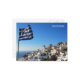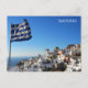 Postcard with Greek flag on Oia village, Santorini Island in Cycladese