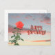 Single pink rose on leafy green stem, is held up against a sunset sky. Golden sky at bottom and blue-gray sky at top. Pink and gray clouds are scattered across the sky. "Happy Birthday" is in pink text with a black drop shadow (may be edited to your sentiment).