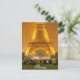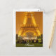 People hanging in the warm glow of the illuminated Eiffel Tower in Paris in the late evening.