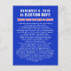 Are you writing postcards to voters this election cycle? These beautiful blue postcards have extensive voter information, very useful for voting on election day. On the back of the card is text you can change (for example, you can put your contact information or your name there, and it will appear on all the postcards you buy) or you can delete that text so these cards are ready for you to fully personalize.