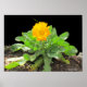Orange flower blossom, the first bloom this spring, this calendula blossom stands out against a black background. Bright green leaves contrast against the dark earth.
