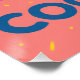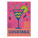 The poster explodes with patterns and colors. A large glass of stylized cocktail, made of zigzag and flat, reigns in the center on an electric pink background scattered with random shapes: turquoise triangles, yellow confetti, black lightning. Twisted straws come out of the glass, and slices of lemon are drawn over-printing. Grid patterns, waves and dots create a controlled chaos typical of Memphis. The word "Cocktails" is written in round, naive letters at the bottom, in a bright blue color.