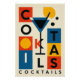 The poster is organized around strict geometric shapes: squares, circles and lines arranged in an asymmetrical but balanced composition. The word "Cocktails" is typographically deconstructed, with each letter occupying its own colorful area. Shapes reminiscent of stylized glasses, straws and bubbles are integrated into the colored blocks. The primary red palette, bright yellow, cobalt blue, black and white. The background is broken white to bring out the graphic intensity of pure colors.