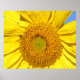 Large sunflower with a house fly on a petal. Geometric pattern of seeds is clearly visible in center of brilliant yellow petals. Some blue sky is visible at the edges.