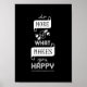 A poster with the inspirational quote: 'Do more of what makes you happy'. Great to hang into your office to get inspired to do work you love, or hang into the living room as a reminder to spend more time om hobby's and family.