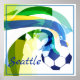Poster shown with a soccer ball art print and sample text of Seattle on it.