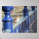 Bird sitting on a fence. A brown sparrow nestled on the top railing of blue iron fence. Depth of field is obvious in this photo.