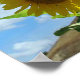 Two bright yellow sunflowers with brown hill, blue sky and fluffy white clouds in background. This image will brighten up any room.