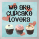 Decora tu cocina con este póster diseñado especialmente para los amantes de los cupcakes, con un fondo azul con corazones, con el texto WE ARE CUPCAKE LOVERS y con 3 cupcakes.