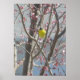 Yellow bird. This yellow breasted finch with black wings and head is sitting proudly in a cherry tree that is just beginning to show its pink blossom.