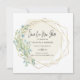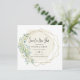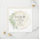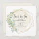 An elegant way to let friends and family know you have rescheduled your wedding. A gold geographic frame surrounds your wedding date details. The soft ivory white background highlights the text. Save Our New Date is written in a modern script, with details following. Very pretty blue wildflowers are nestled in sage green foliage leaves decorate the geometric gold frame. The save our new date card background is beige.