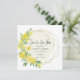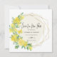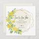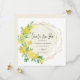 An elegant way to let friends and family know you have rescheduled your wedding. A gold geographic frame surrounds your wedding date details. The soft beige background highlights the text. Save Our New Date is written in a modern script, with details following. Very yellow mimosa flowers are nestled in green foliage leaves decorate the geometric gold frame. The save our new date card back is also beige.