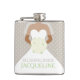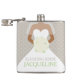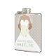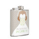 Elegant graphic bride with veil holding a posy of white green stylized roses wedding hip flask. Reads Blushing Bride Jacqueline. Personalize with your own name and title or words to help calm the bride on her big day. Also a great gift idea for bridal showers, hen nights or wedding rehearsals. Art and design by www.mylittleedenweddings.com