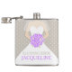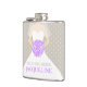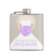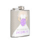 Elegant graphic bride with veil holding a posy of purple lilac stylized roses wedding hip flask. Reads Blushing Bride Jacqueline. Personalize with your own name and title or words to help calm the bride on her big day. Also a great gift idea for bridal showers, hen nights or wedding rehearsals.
