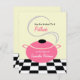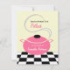 A potluck party invitation featuring an illustration of a pink cooking pot with handles and lid. Pot is sitting on a black and white surface and has steam coming from under the lid. Personalize the text on front and back. Back features black and white surface image at bottom.