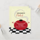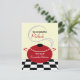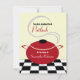 A potluck party invitation featuring an illustration of a red cooking pot with handles and lid. Pot is sitting on a black and white surface and has steam coming from under the lid. Personalize the text on front and back. Back features black and white surface image at bottom.