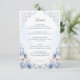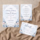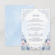 This romantic wedding details design features powder blue watercolor florals, soft blush accents, and delicate vintage-inspired scrollwork. The graceful layout is ideal for sharing reception, accommodation, RSVP, and wedding website information in a polished and elegant way. Its airy botanical styling suits classic, formal, garden, and timeless wedding themes beautifully. The soft blue palette and ornate floral framing make it a lovely coordinating piece for a refined wedding stationery suite.