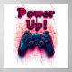 A black video game controller with red accents is depicted against a white background. The controller is positioned in the center of the image, with the phrase "Power Up!" in pixelated, pink letters above it. The background features a stylized circuit board pattern in Tones of pink and blue, creating a powerful and energetic atmosphere.