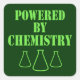 Powered By Chemistry - dark green sticker with bright green lettering and Erlenmeyer flasks.
