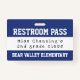 Blue student hall pass with customizable text. Restroom pass in blue and white personalized with class or teacher name, and the name of the school.