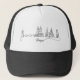 This trucker hat features a silhouette style line art illustration of the skyline of Prague.