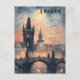This travel postcard, in flat illustration style, showcases the European skyline of Prague, Czech Republic.