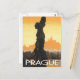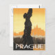 Prague, Czechoslovakia scene from a vintage travel poster with statue in the foreground and skyline in the background, with the name Prague in deco font at bottom.