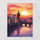 This captivating artwork depicts Prague’s iconic Charles Bridge at sunset, bathed in a fiery palette of orange, pink, and violet. The majestic gothic towers and domes of the Old Town loom under a vast sky streaked with dramatic clouds, while the golden sun descends behind the cityscape. The Vltava River mirrors the sky’s colors, intensifying the dreamlike quality of the moment. It's a vibrant celebration of Prague’s historic beauty and its timeless romantic charm.