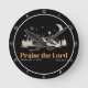 An evocative art piece featuring a serene night landscape with mountains, evergreen trees, a crescent moon, and stars. The bold text PRAISE THE LORD is prominently displayed, with FROM THE EARTH and PSALM 148 below it. The design is rendered in a natural, earthy palette against a black background, conveying a profound spiritual message rooted in creation.