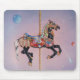 A dramatic black carousel horse with trappings in jewel tones of royal blue, deep red, purples and accented with carved pink rosettes. Feel free to personalize your purchase to make it your own.