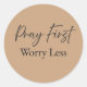 Minimalist Christian sticker featuring the faith reminder “Pray First, Worry Less” in a warm muted gold background.