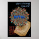 Striking original digital painting by Leslie Sigal Javorek. On a black background is a vibrantly colored globe representing Jerusalem; behind it is a copy of the 1917 document wherein Lord Balfor declared Palestine a sovereign nation and homeland for the Jewish people. The royal blue Hebrew text spells 'Shalom' (peace); text in lower left is an English translation of the top right Hebrew.