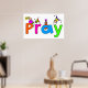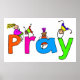 Cute cartoon illustration of happy and diverse little boys and girls climbing over giant letters of the alphabet that spell out the word PRAY. Image available on various gifts and products. Posters. Prints.