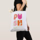 This girlie tote bag features the word PUSH in a modern pink and orange simple daisy font with the copy "pray until something happens" below. The back side of this pretty tote has a pink and green daisy pattern and is personalized with your monogram initial and name.