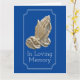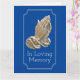 A plain, elegant and meaningful design of faux copper praying hands with a faded look set against a dark blue colored background. The hands are framed by a thin white vertical scallop frame and the words "In loving memory" appear below the hands. Personalize the color of the background and change the wording and poem to any of your personal choice. Suited to both men and women.