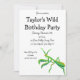 This invite features a painted illustration of a praying mantis in bright green with orange accents and is ready to be customized with all of your party details.