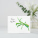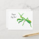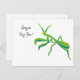 This postcard features a painted illustration of a praying mantis in bright green with orange accents and is ready to be customized with your own message on the front. The back of this card is blank for you to write in your own message.