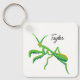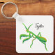 This keychain features a painted illustration of a praying mantis in bright green with orange accents and is ready to be personalized with a name in black script lettering.