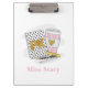 This pre kindergarten teacher clipboard keeps your papers in one place when you leave the classroom. Great teacher gift.. Pattern has a white notebook with black polka dots, a gold pk, heart coffee, ruler, pen and pencil. This white notebook with black polka dots design can be found on other items in my shop, PageCreativeDesigns.
