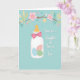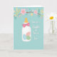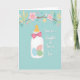 This card features a soothing pastel illustration with a transparent feeding bottle centered on a calm aqua background, tied at the neck with a soft pink bow that suggests a caring, affectionate bond. Inside the bottle sit three smooth egg shapes in sky blue, blush pink, and pale sage green, nestled close together like friends leaning in for a gentle photo 🐰. Across the top, curving floral branches frame the scene with light pink blossoms, sunny yellow petals, tiny blue-and-white flowers, and fresh green leaves 🌷. On the right side, a short message appears in flowing cursive-style lettering, set in a medium pink that stands out without feeling harsh. The spacing leaves plenty of open air around the central image, giving the bow and eggs room to feel quietly intimate, as if they’re being presented with care. Subtle shading on the bottle and eggs adds a soft glow, while the flowers above create a tender canopy that feels like a small celebration. Delicate green leaves peek between the blossoms, and the pink bow’s tails drape slightly downward along the bottle’s neck.