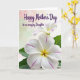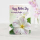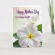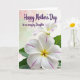 Designed with two white blossoms as the main focus, the scene feels like a gentle garden moment shared between loved ones ❤️. A large flower fills the lower foreground, its wide petals softly curved and traced with thin pink veins that guide your eye toward a warm golden-yellow center. Just above and behind it sits a second, smaller bloom in softer focus, echoing the same white petals and sunny core like a quiet companion nearby. Small touches of green leaves peek in from the lower edge and side, adding a grounded contrast to the pale petals. Across the upper area, the message “Happy Mother’s Day to an amazing Daughter” appears in flowing purple lettering, standing out clearly against the light background. Behind everything, the backdrop fades smoothly from blush pink into light green, keeping the flowers and words front and center 🌼. The lighting stays soft and diffused, showing gentle petal texture and subtle shading around the blooms. The purple text sits above the blossoms while the pink-to-green gradient remains blurred and airy in the background.