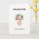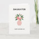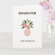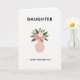 This card shows a simple floral illustration that feels like a quiet hug between family members ❤️. A rounded vase in muted blush pink sits near the bottom center, holding a bouquet of soft pink flowers, including one fuller bloom with a darker center, a more open flower, and a few small buds. Tucked among them is a white daisy-like flower with a sunny yellow center, adding a gentle contrast that makes the arrangement feel bright and caring. Broad, deep emerald-green leaves spread around the blossoms, giving the bouquet a lush frame without crowding it. The background is a light off-white, leaving plenty of open space that makes the flowers feel like they’re being offered with calm affection 🌼. Near the top, the word “DAUGHTER” appears in uppercase sans-serif letters in a dark tone, centered above the flowers. Below the vase, “HAPPY MOTHER’S DAY” is centered in matching dark uppercase text. The composition is balanced with the blush vase, pink petals, white bloom, and green leaves standing out crisply against the pale background.